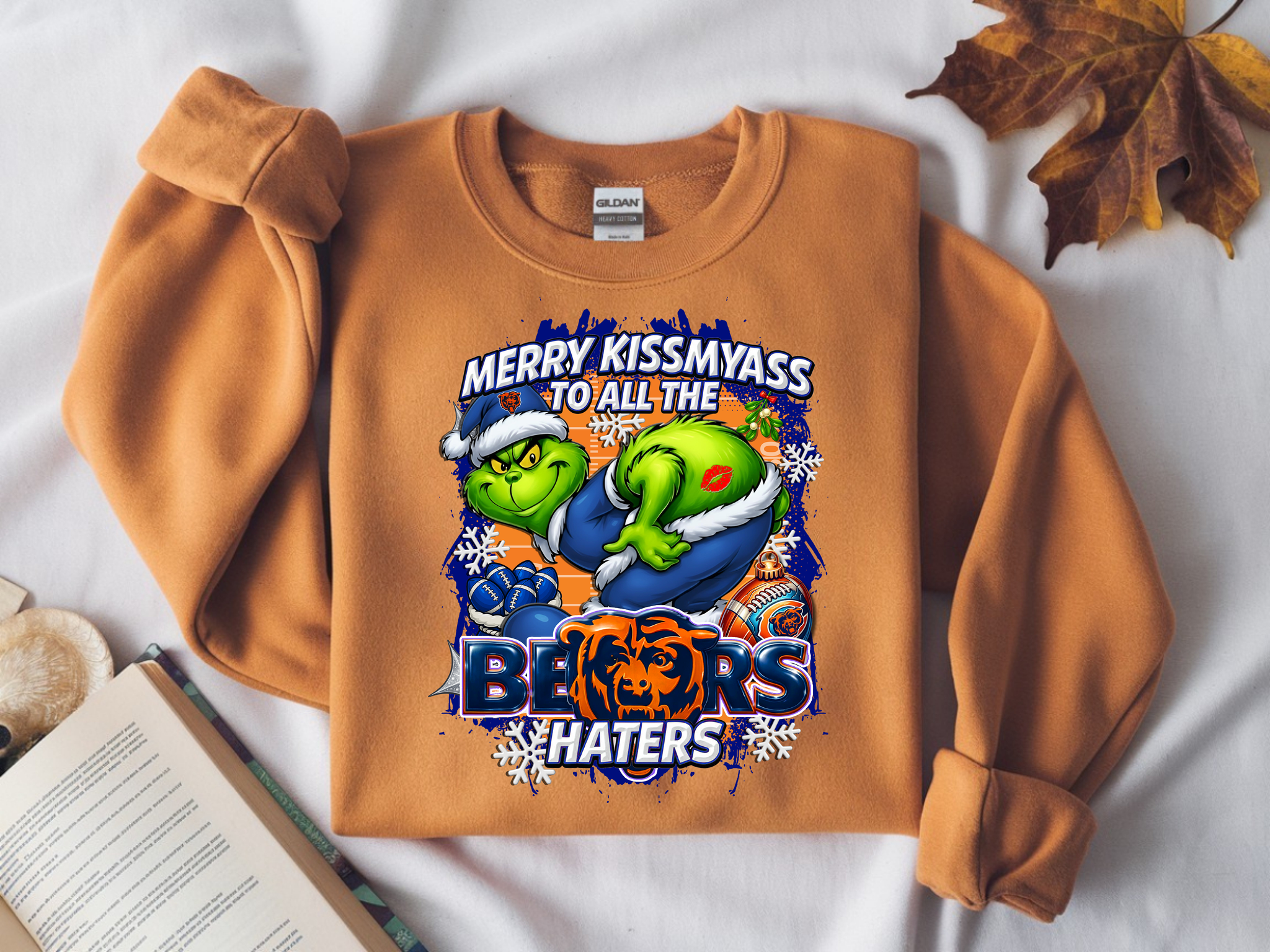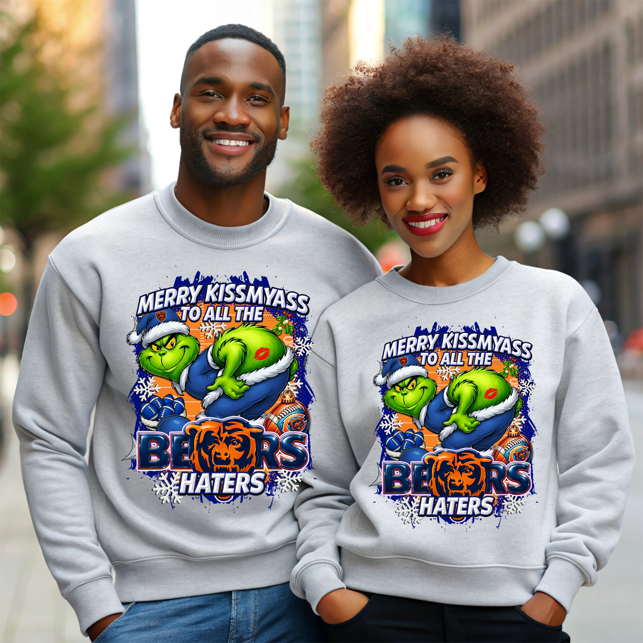Gear up for the holidays like a true fan and bring the heat with Da Bears and Da Grinch teaming up for the ultimate holiday smackdown! This “festive” Merry KissmyAss to All the Bears Haters sweatshirt is the perfect way to run a victory lap around every trash-talker in your path.